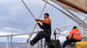 The crew setting sails. The schooner has ability for sailing by engine or by sails.
