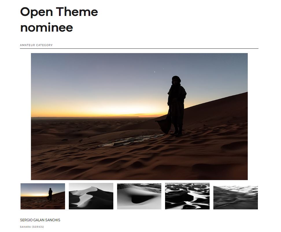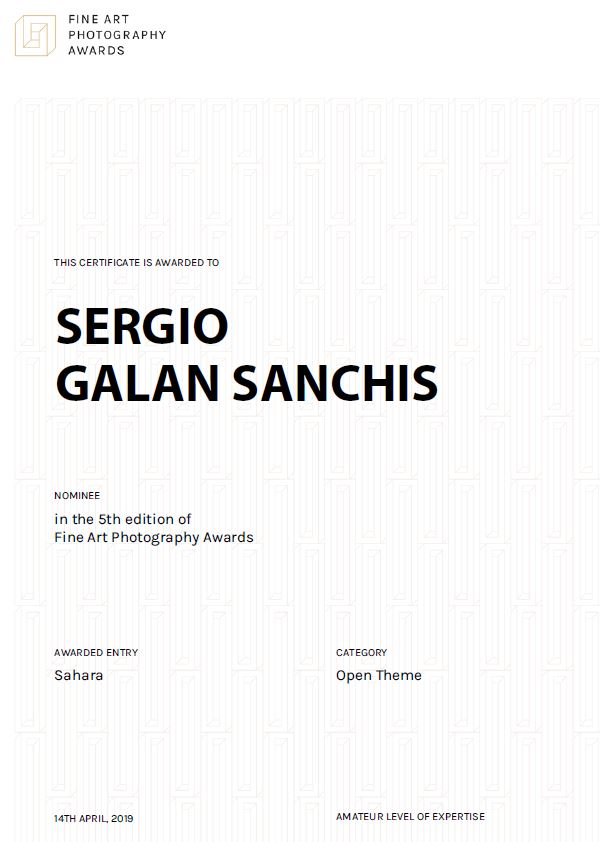 5th FAPA Awards nominee I’ve been awarded in the 5th FINE ART PHOTOGRAPHY AWARDS in Open Theme photography with the serie “Sahara”. 2019. Link Compártelo: Click to share on X (Opens in new window) X Click to share on Facebook (Opens in new window) Facebook Like Loading...